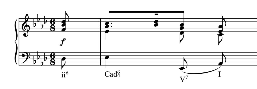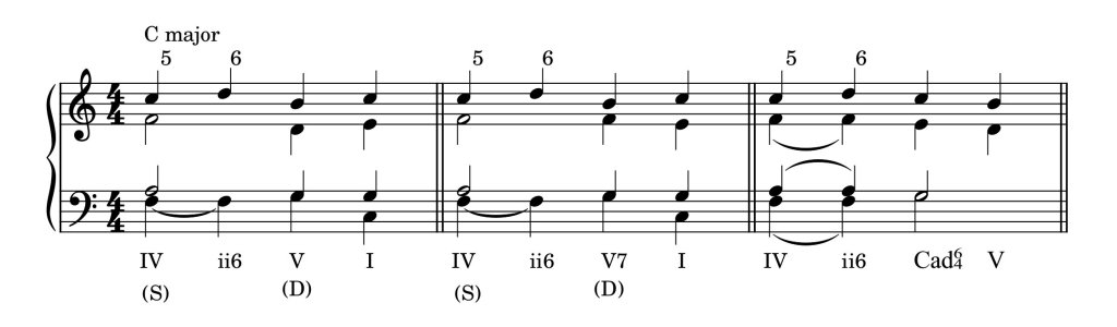II6 is used in cadences before either Cad64 or V chords when the soprano line moves down from the second to the first scale degree, while the bass simultaneously moves up from the fourth to the fifth scale degree (see Examples 2 and 3).
