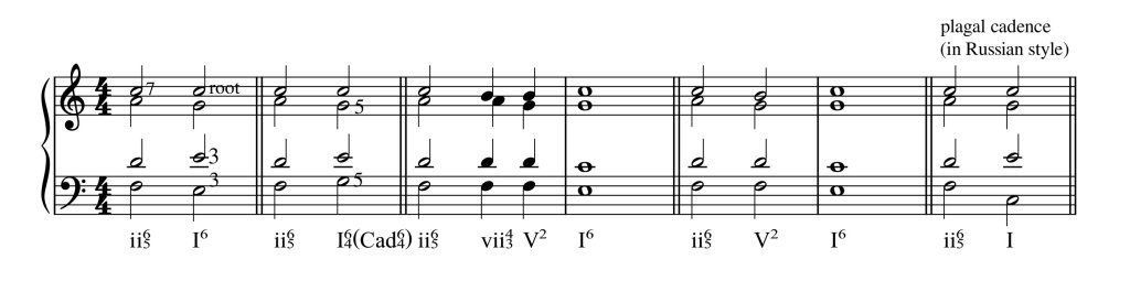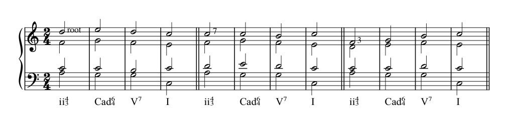 The II7chord is irreplaceable in a cadence when the soprano voice moves from the fourth to the third scale degree. In this case, the II7 chord resolves into the Cad64 chord with a bass leap from the second to the fifth scale degree: